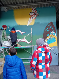 Pour anticiper les prochains travaux sur la végétalisation de la cour d'école, les élèves de CP, CE1, CE2 et CM1 ont participé à la création d'une fresque dans la cour de l'école sur le thème des insectes avec l'artiste Rafat.